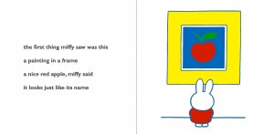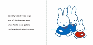 Father Bunny thinks that Miffy is too small to go to an art gallery, but she persuades him to let her come along with him and Mother Bunny. Miffy sees paintings, a mobile and even a stone statue, which is all very exciting. Miffy soon decides that she wants to be an artist when she grows up.